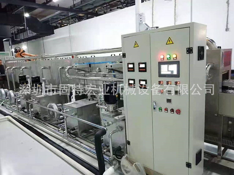 新能源鋰電池鋁殼超聲波清洗機由PLC可編程器自動控制清洗,設(shè)備生產(chǎn)主線由2個超聲波溶液清洗脫脂槽、3個超聲純水漂洗槽與1個漂洗槽及1個純水慢拉脫水槽、熱風(fēng)凈化隧道干燥系統(tǒng)組成,共7個槽位。在超聲溶劑槽中,利用超聲波強勁的滲透力沖擊工件表面并結(jié)合溶劑的除油去污能力,使緊附在工件表面的油污迅速脫落,清洗、漂洗、脫水及高效過濾熱風(fēng)干燥使之達(dá)到高潔凈度要求,從而達(dá)到洗凈目的,徹底清洗工件。